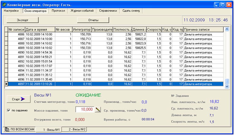 - регистрация текущих и средних значений измеренной производительности, линейной плотности материала и скорости движения конвейерной ленты;