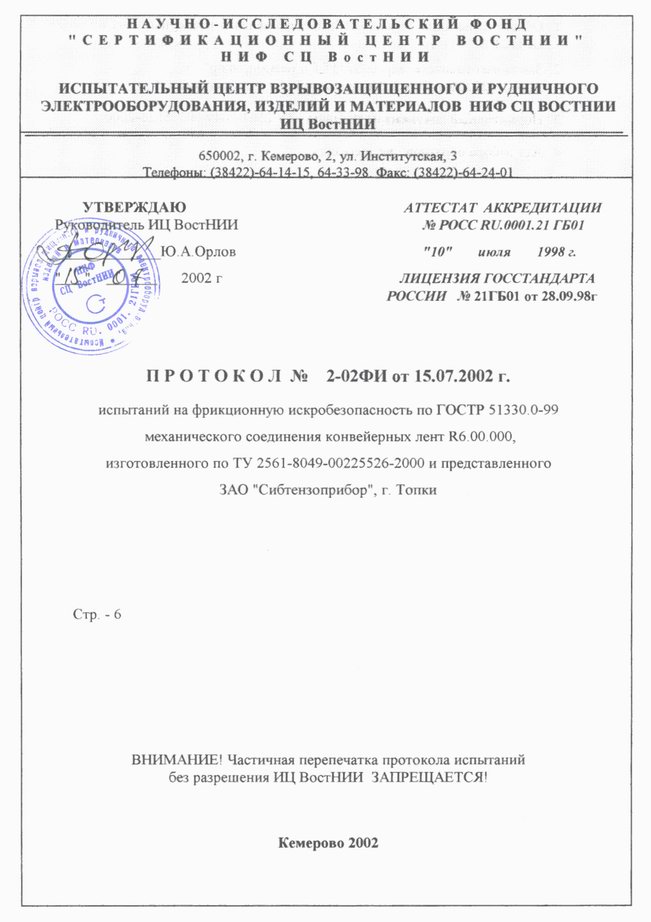Данное изделие получило Свидетельство на полезную модель №16946 от Российского Агентства по патентам и товарным знакам и прошло испытания на фрикционную искробезопасность по ГОСТ Р 51330.0-99, что подтверждает Протокол №2-02ФИ от 15.07.2002, выданный Сертификационным центром ВостНИИ.